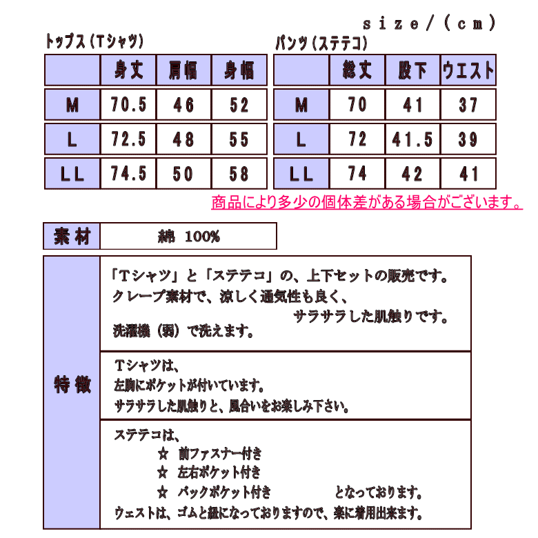 素材 綿 100% サイズ Mサイズ 胸囲88〜96 身長165〜175 ウエスト76〜84 Lサイズ 胸囲96〜104 身長175〜185 ウエスト84〜94 LLサイズ 胸囲104〜112 身長175〜185 ウエスト94〜104 特徴 ・「Tシャツ」と「ステテコ」のセットでの販売です。